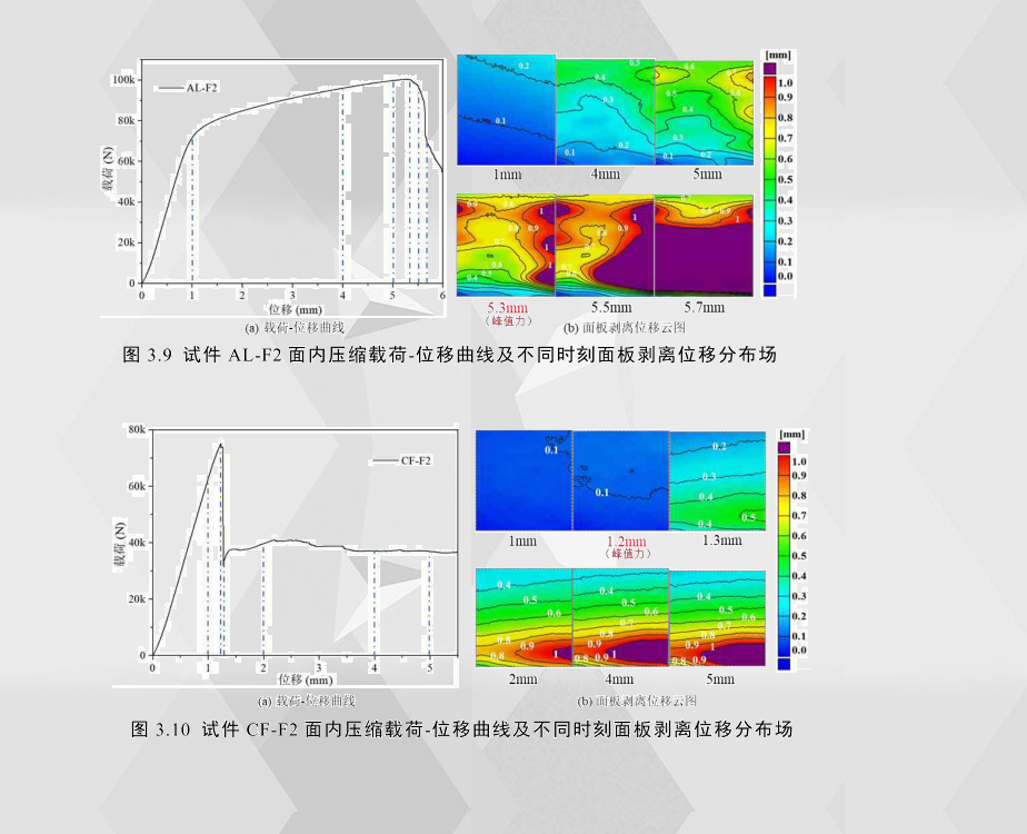 對面板材料為彈塑性材料的鋁合金夾層結構AL-F2而言,在發生面板局部屈曲之前,剝離位移場的分布規律較為隨機;當曲線達到峰值載荷時,面板邊緣出現多處局部屈曲,隨后面板與芯層之間的分離面積以及分離程度隨加載位移的增加而變得越來越大,面板的屈曲程度也越來越大,面板的承載能力顯著降低,導致試件整體承載能力急劇下降。對面板材料為脆性材料的碳纖維增強夾層結構CF-F2而言,在峰值載荷之前,發生面板斷裂的一側邊緣先出現剝離位移,而另外一側剝離位移非常小,與鋁合金夾層結構相比,纖維增強夾層結構的剝離位移要小很多;峰值載荷之后,面板剝離位移分布場呈現較為規律的帶狀分布,分布規律為以斷裂處為中心,向上下兩邊緣呈帶狀擴散;從剝離位移分布場可以看出纖維增強夾層結構的面板斷裂方式為某一側先發生斷裂破壞。