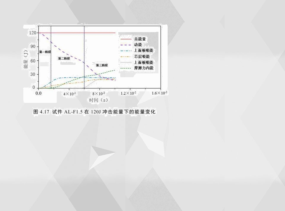 圖4.17為試件AL-F1.5的各組成部分在低速沖擊仿真中能量變化。從圖中可以看出,初始沖擊能量主要由上下面板、泡沫鋁芯層的內能以及各組成部分的摩擦能四部分組成。從各部分能量轉化趨勢可以看出,整個沖擊過程基本可以分為三個階段。第一階段主要由上面板吸收能量,摩擦力做功較少。第二階段摩擦力做功迅速增加,成為主要吸能部分。第三階段由于下面板發(fā)生較大塑性變形,下面板成為主要吸能部分。