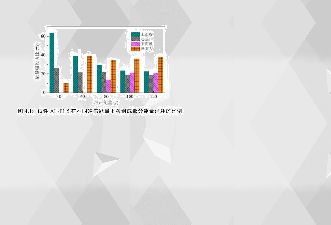 4.18AL-F1.5在不同沖擊能量下各組成部分能量吸收的比例。上面板消耗的能量比例在小能量(40J)沖擊下最大(高達(dá)64%),芯層耗能占比為26.5%,因此在小能量沖擊下,增強(qiáng)上面板和芯層的防護(hù)更能提高結(jié)構(gòu)的耐沖擊性能;當(dāng)下面板完全穿透時(shí),摩擦力消耗的能量占比最高(約為38%);有趣的是,在各沖擊能量下,泡沫芯層吸能占比均在20%左右;此外還發(fā)現(xiàn),無論夾層結(jié)構(gòu)穿透與否,上面板的耗能占比均大于下面板,這說明增強(qiáng)上面板更能提高夾層結(jié)構(gòu)的耐沖擊性。
